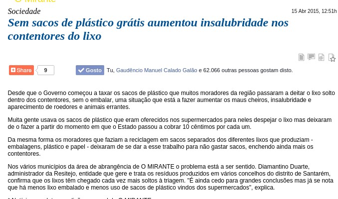 Esta é daquelas noticias que não constituem novidade para ninguém. Excepto, talvez, para os políticos que decidiram inventar mais um imposto, ecologistas e outras pessoas que vivem numa espécie de realidade paralela. Estava-se mesmo a ver que poucos seriam os que passavam a comprar sacos para o lixo e que as consequências da inexistência de sacos grátis iam ser as que mostra o recorte que acima publico. E, por enquanto, ainda existem locais onde os sacos são à borla e quem tenha um stock apreciável em casa...