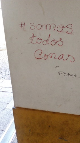 Não estou, assim de repente, a perceber que mensagem pretende transmitir a criatura que se deu ao trabalho de escrever esta enigmática e perturbadora frase numa parede situada num espaço público. Bem no centro de uma cidade, mais propriamente. Estará, se calhar, a considerar que isto é tudo uma cambada de medricas, cagarolas e fracotes que é o significado que o dicionário de português atribui a “coninhas”. Mas isso, lá está, sou só eu a divagar. Até porque, embora não seja essa a minha intenção, esta leitura pode revelar-se ofensiva para um - ou mais, que sei eu – dos muitos géneros que agora para aí há.