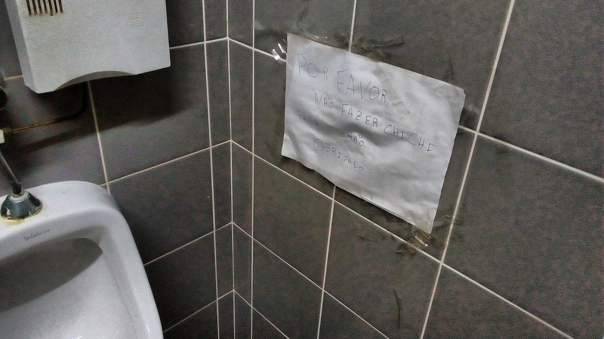 Uma porcaria, isso de mictar para o chão. Coisa própria de um porco, a bem-dizer. Merecedora, diria eu, de um aviso menos fofinho. Assim tipo, “vê lá se acertas no mictório, meu palhaço” ou “não sejas otário, mija no sanitário”. Com uma seta a apontar para o alvo e tudo. Que isto, com certa malta, não vai lá com delicadezas.